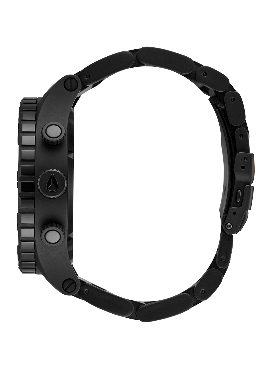 Five 13's mark each hour mark around the dial, with only one 13 being debossed with painted black gloss fill. Which one? Well, that depends on what part of the world you get it from. The pushers and screw-down crown are located on the 9 o'clock side of the case instead of 3 o'clock to prevent "wrist bite" during active use. Uni-directional rotating bezel for an analog countdown timer. Six hand chronograph with 24-hour timer and second timer sub-dials, all in a super black and neon red tone.