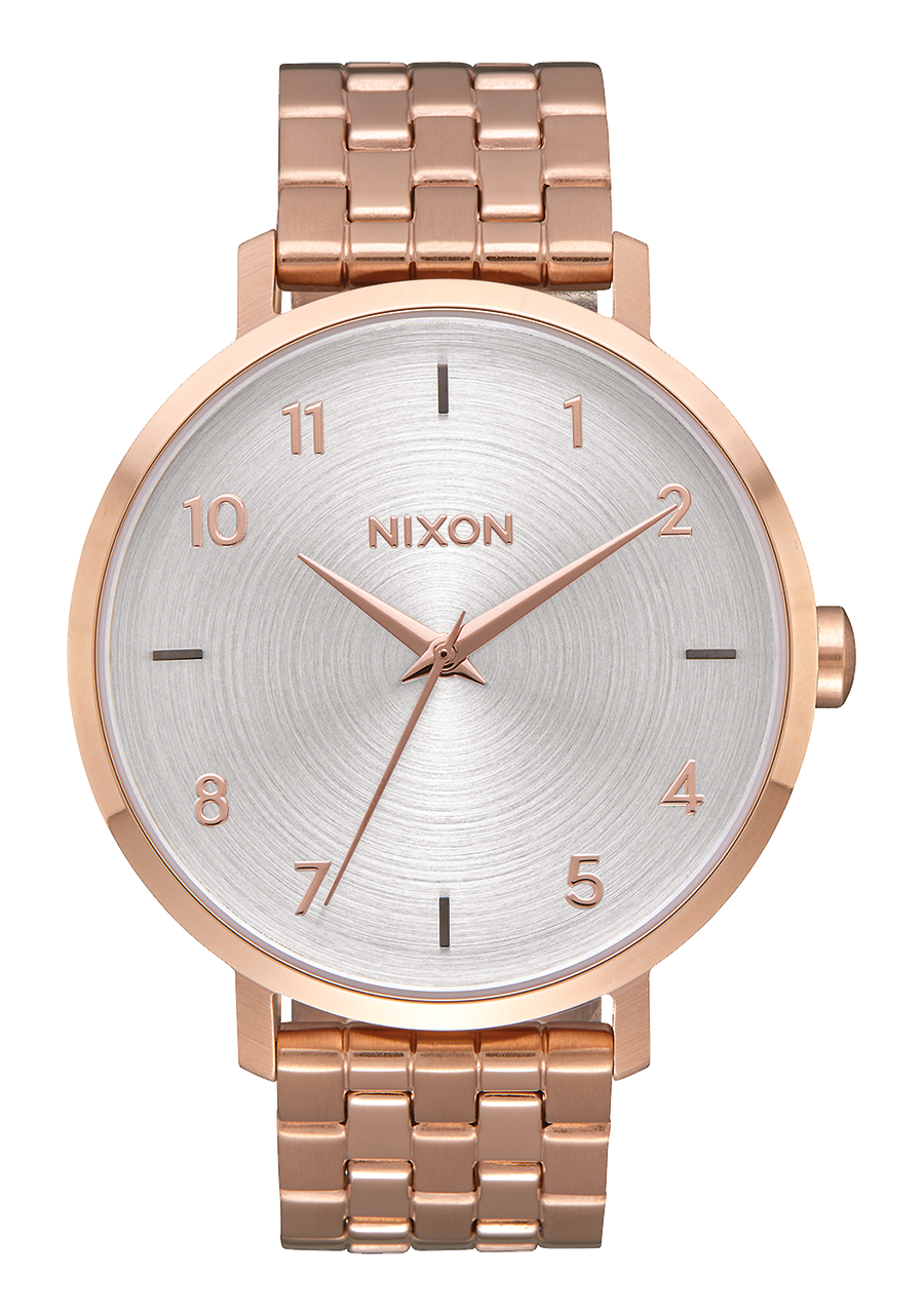 Dial features applied Nixon wordmark and hour markers in Arabic and stick format. Also features printed numbers and custom molded hands.