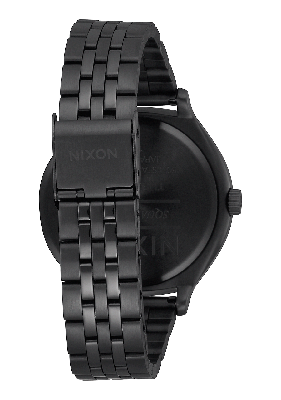 38mm, 50 meter / 5 ATM, custom solid stainless steel case, hardened mineral crystal, stainless steel snap fit caseback and spring pin lugs.