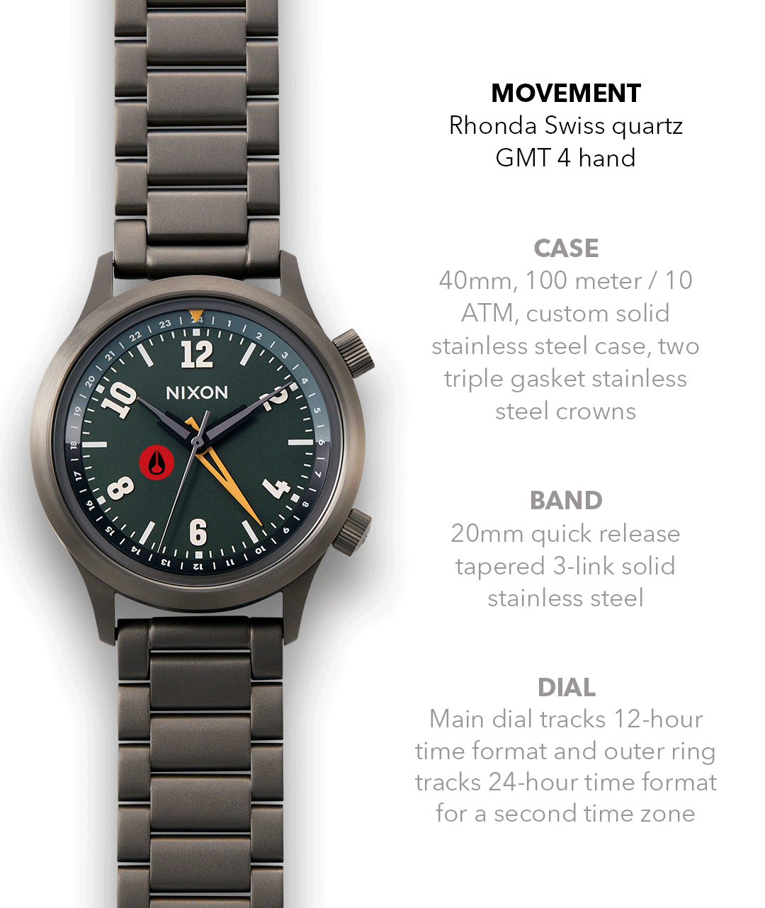 Dial is built with an angled stadium ring on a 24-hour time format and features a moveable "be there" indicator for when you need to mark a certain time. Main dial tracks 12-hour time format and outer ring tracks 24-hour time format for a second time zone. The GMT hand with contrast color tracks your 24-hour time format.
