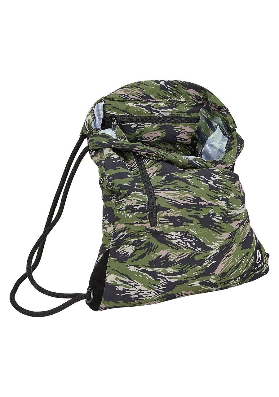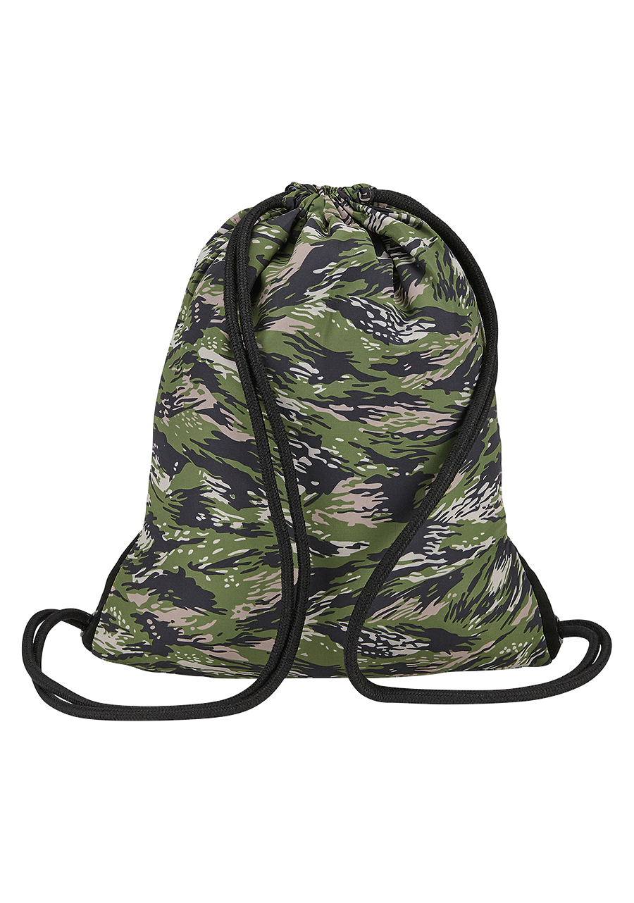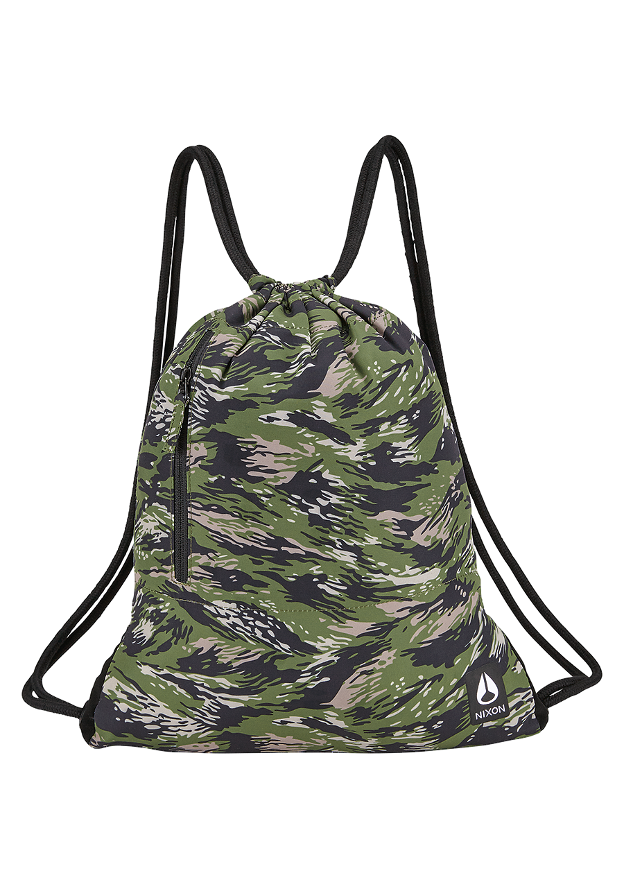 Fun on-the-go cinch bag with cording strap closure. Small vertical accessory pocket.