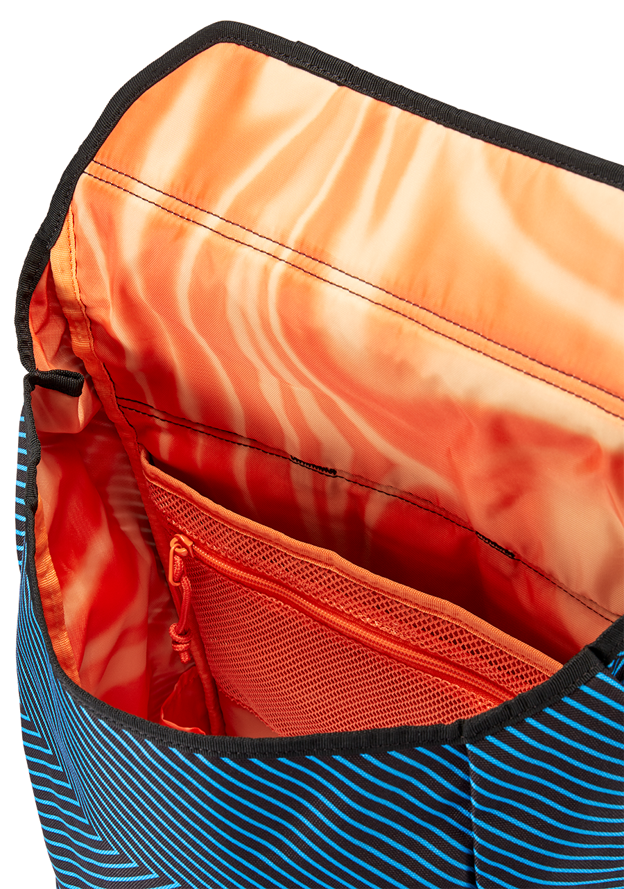 The blue sound wave pattern is on recycled PET fabric that sings a song of sustainability throughout the Grateful Dead Mode Pack, inside and out. A durable 1680D base panel sets the foundation to the 600D main body with 200D lining. This bag is built in for when the road gets bumpy. Main Body: 600D REPREVE® Our Ocean Bottom Panel: 1680D REPREVE® Straps: PP Webbing Liner: 200D Recycled PET