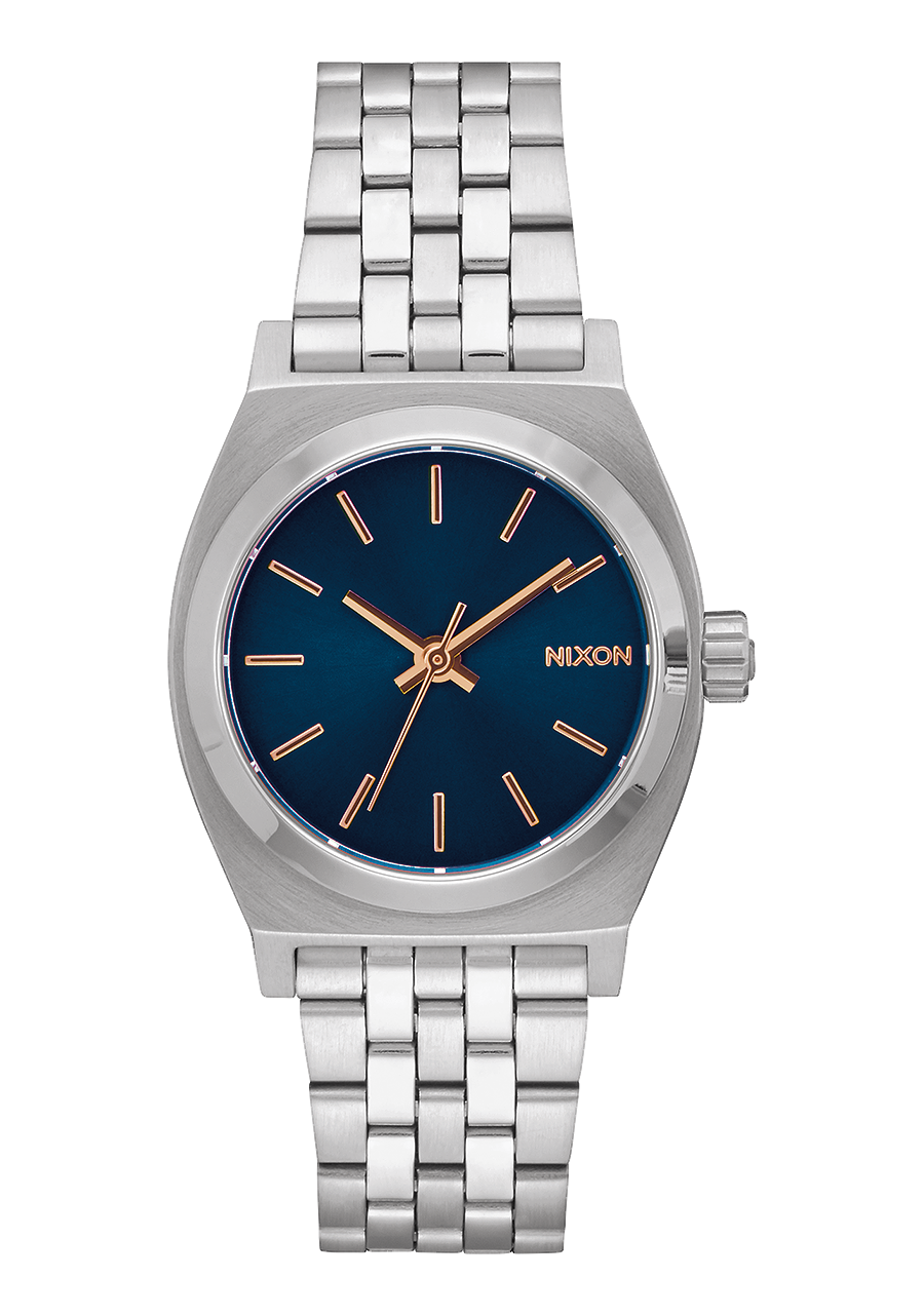 To adjust the stainless steel bracelet of the Medium Time Teller for a secure fit, you can use the sliding adjustment buckle to tighten or loosen the band. This involves sliding the buckle along the band to the desired position. A tool to begin this adjustment is included in the watch box. For more information visit the Nixon blog.