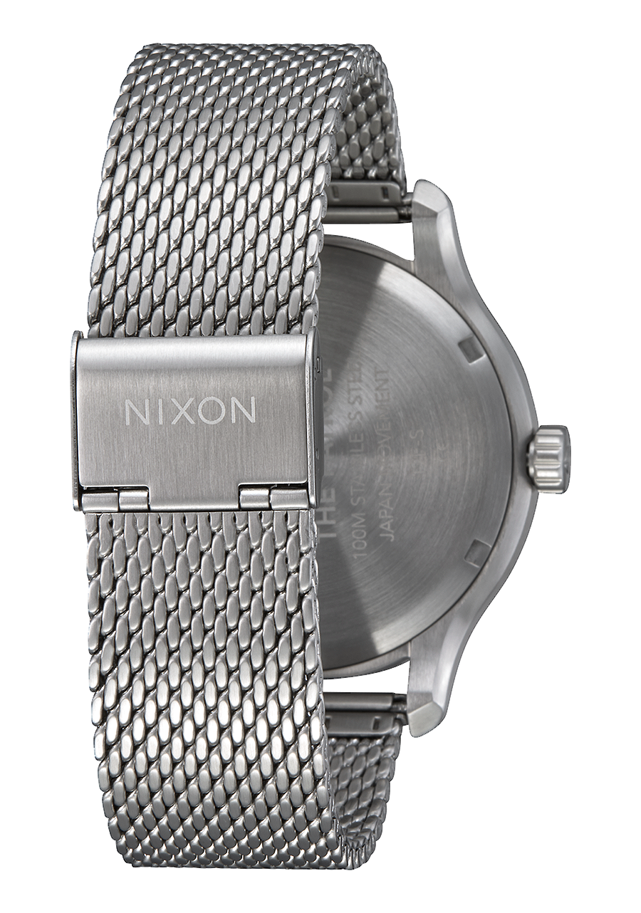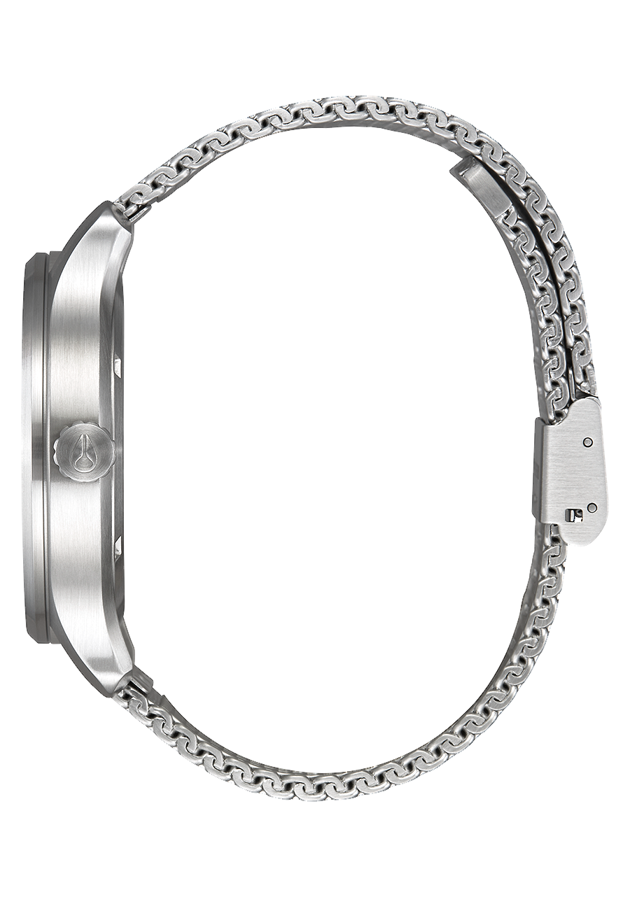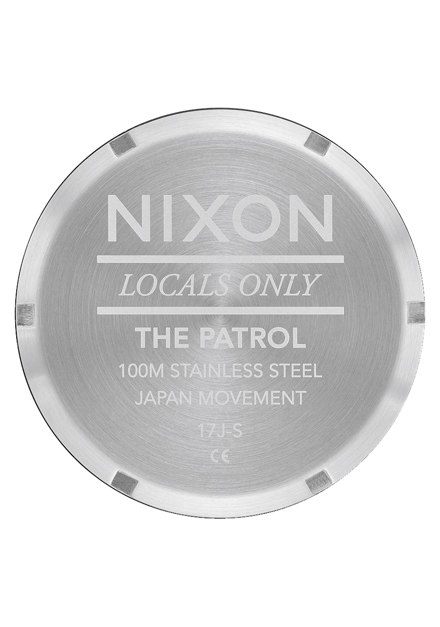 The Nixon Patrol features a 42mm custom solid stainless steel case, with a hardened mineral crystal and stainless steel screw down caseback. The stainless steel 3-link bracelet and included hardware are also made of stainless steel.
