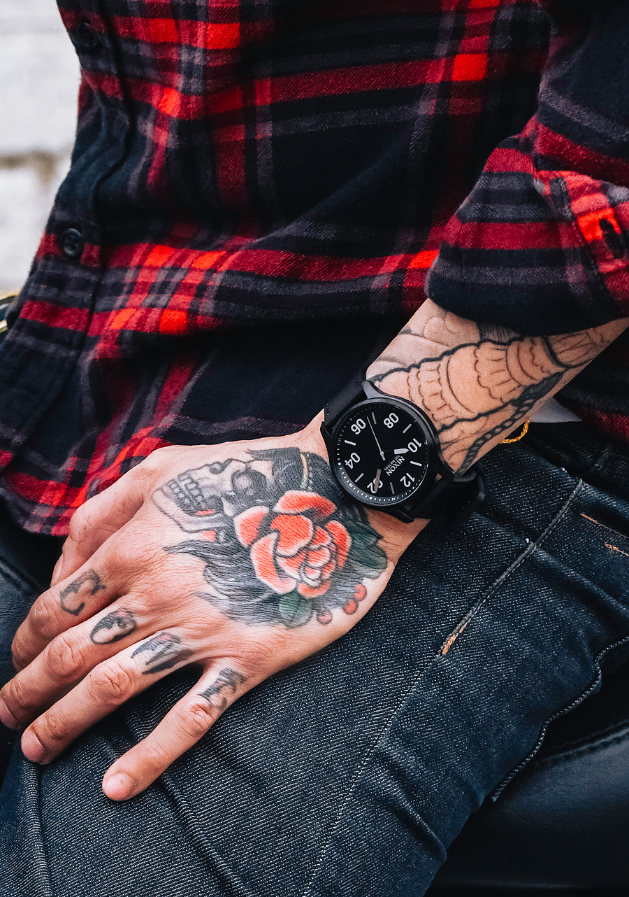 42mm custom solid stainless steel case with a 100 meter / 10 ATM water rating. Comes with a hardened mineral crystal, stainless steel screw down caseback and spring pin lugs.