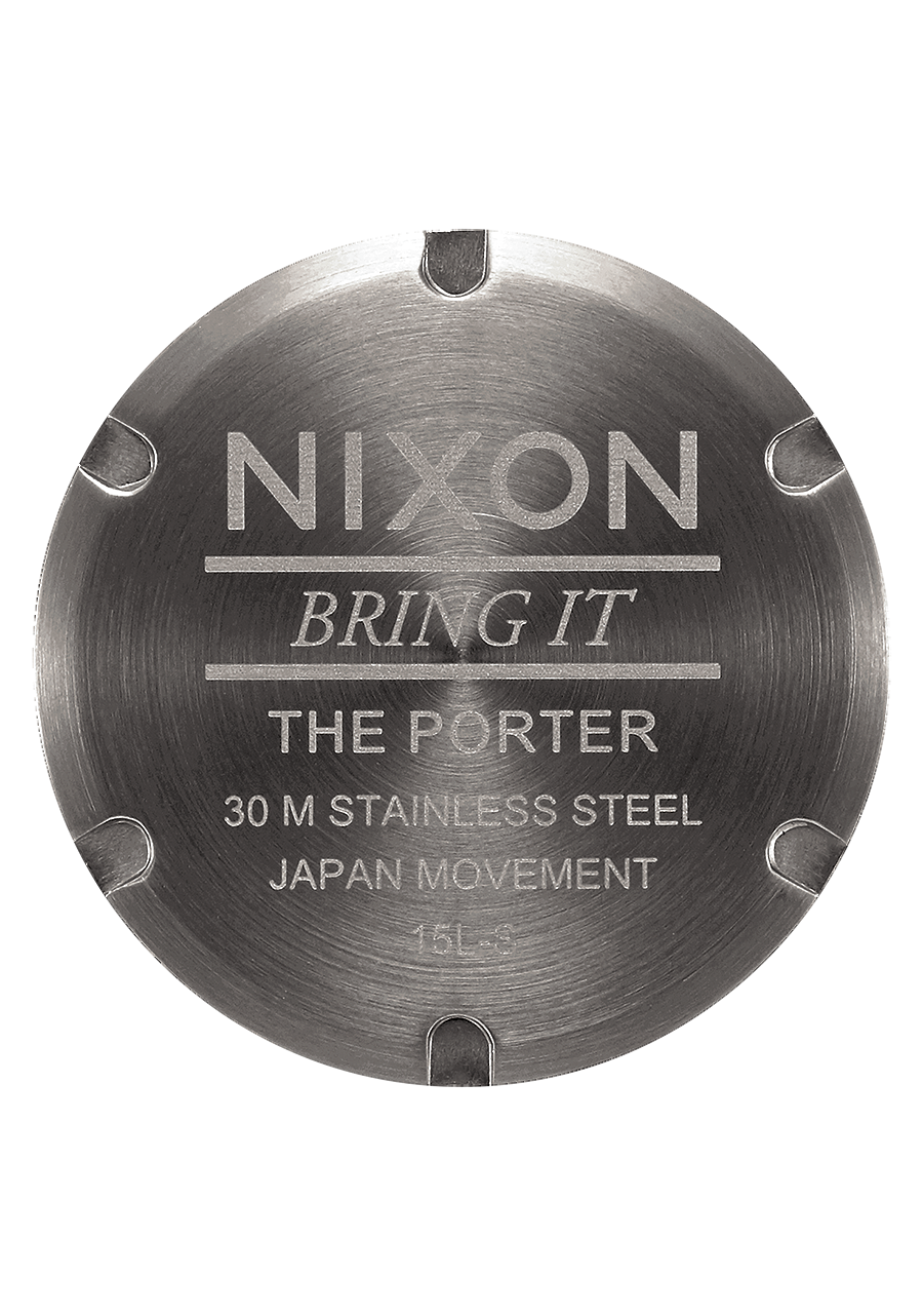 The case of the Nixon Porter Leather is made from custom stainless steel, while the strap is made from leather. To care for the leather band, first wipe away any dust with a dry microfiber cloth. Then get the cloth slightly damp and gently wipe away any dirt from the strap. Finally, let the strap air dry. For more information on cleaning leather watch straps, visit our blog.