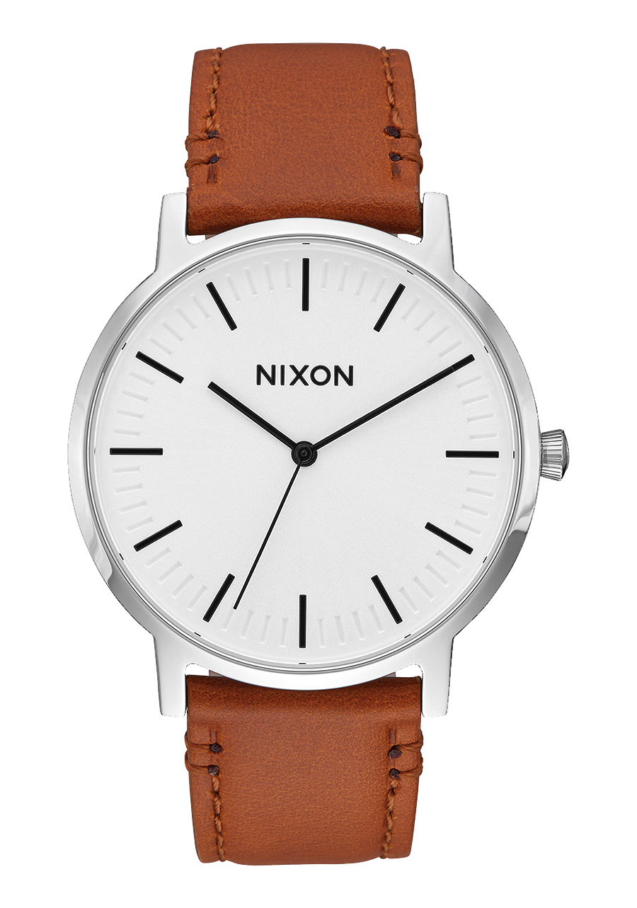 The case of the Nixon Porter Leather is made from custom stainless steel, while the strap is made from leather. To care for the leather band, first wipe away any dust with a dry microfiber cloth. Then get the cloth slightly damp and gently wipe away any dirt from the strap. Finally, let the strap air dry. For more information on cleaning leather watch straps, visit our blog.