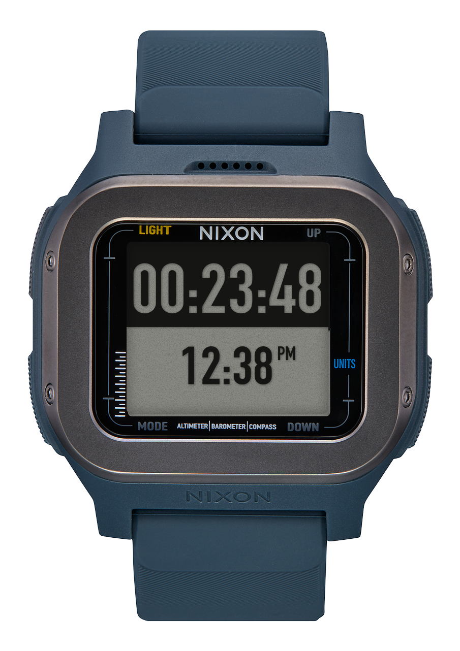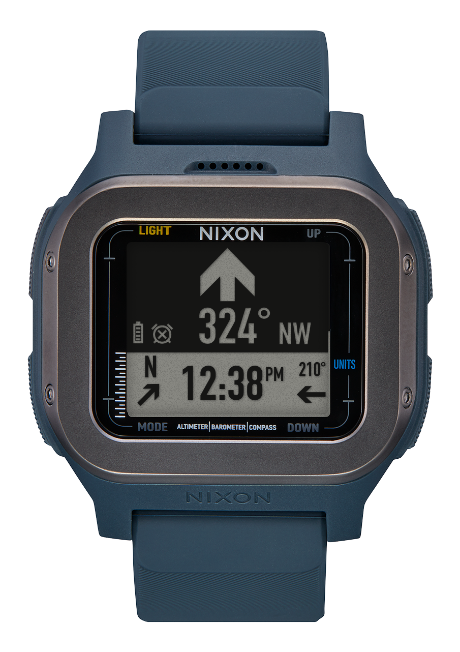 Custom digital module with high resolution MLCD with front light. Functions include altimeter, barometer, compass, thermometer. Camp mode with weather alert, session mode with runs tracker, dual time zones in 12 or 24 hr format, date, chronograph, and alarm.