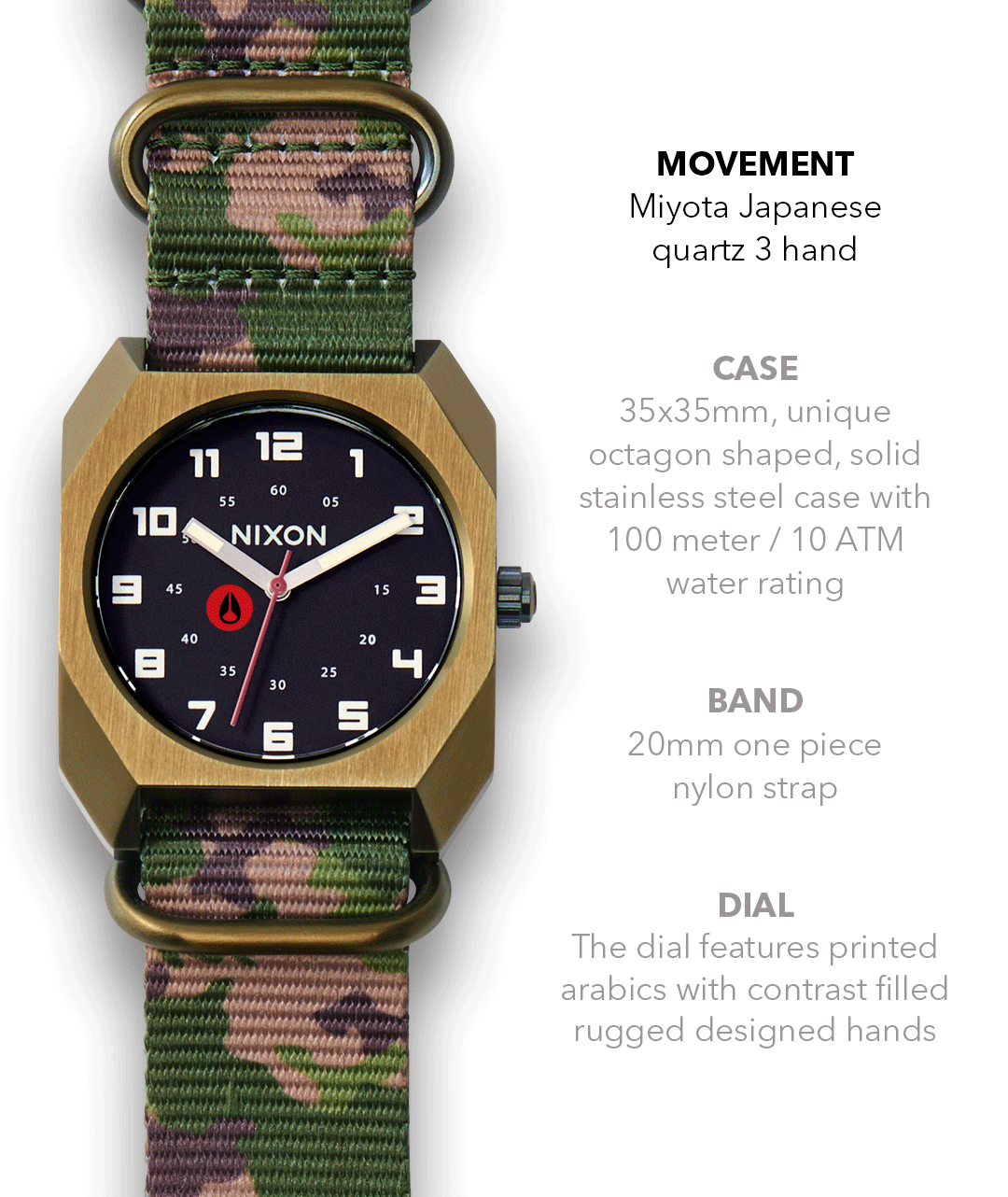 The Nixon Scout features a 35mm custom-built octagon-shaped stainless steel case. The 20mm one piece nylon strap passes through the case and back over a keeper, allowing easy adjusting and a secure fit for different wrist sizes.