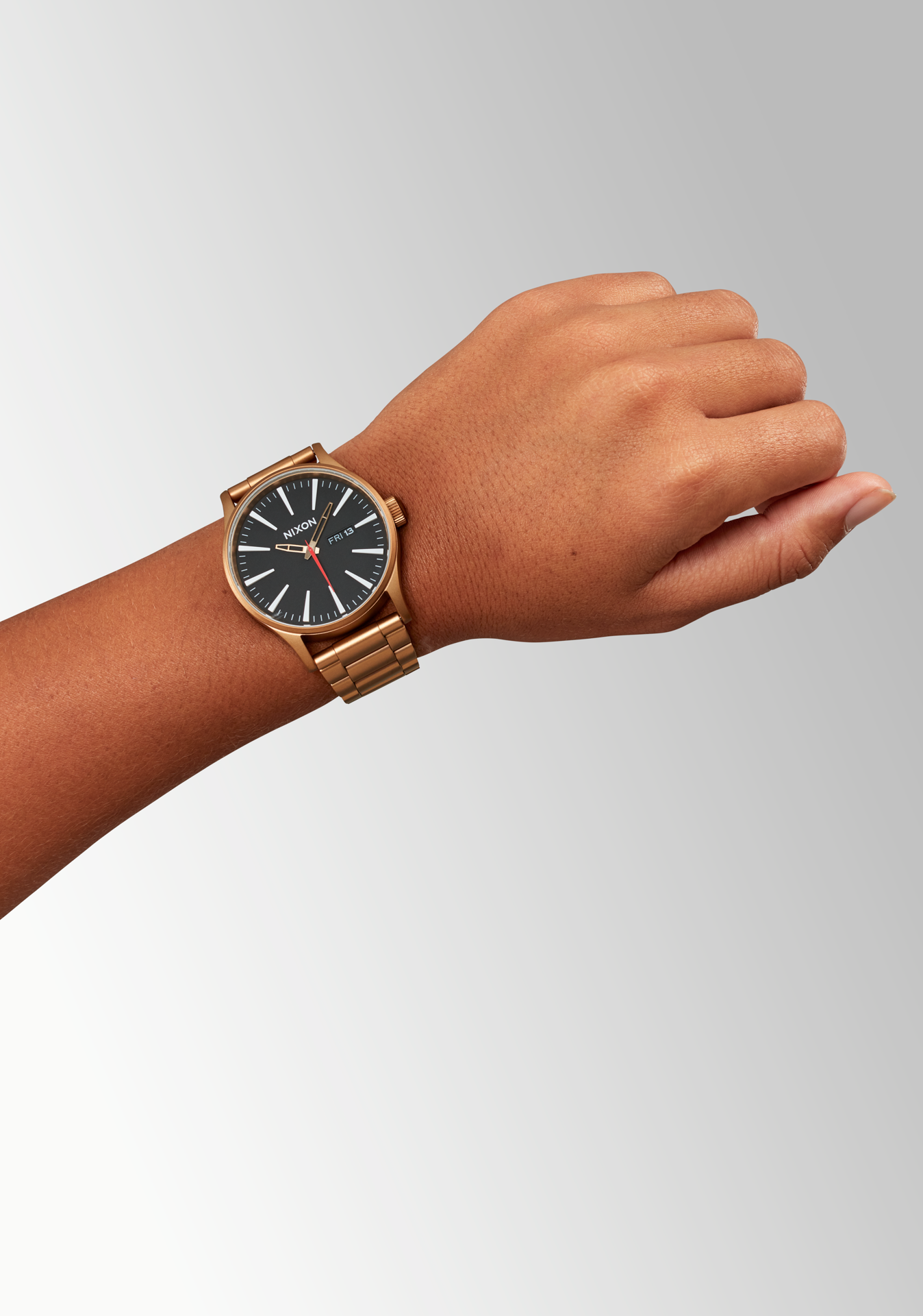 There are two ways to adjust the Sentry Stainless Steel. Smaller adjustments can be made with the micro adjuster and larger adjustments can be made by removing or adding watch links. Visit the Nixon blog to learn how to resize this watch.