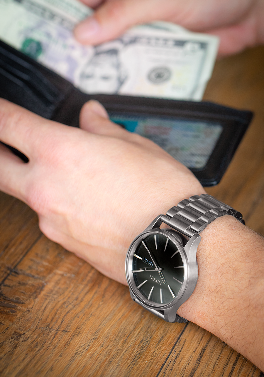 There are two ways to adjust the Sentry Stainless Steel. Smaller adjustments can be made with the micro adjuster and larger adjustments can be made by removing or adding watch links. Visit the Nixon blog to learn how to resize this watch.