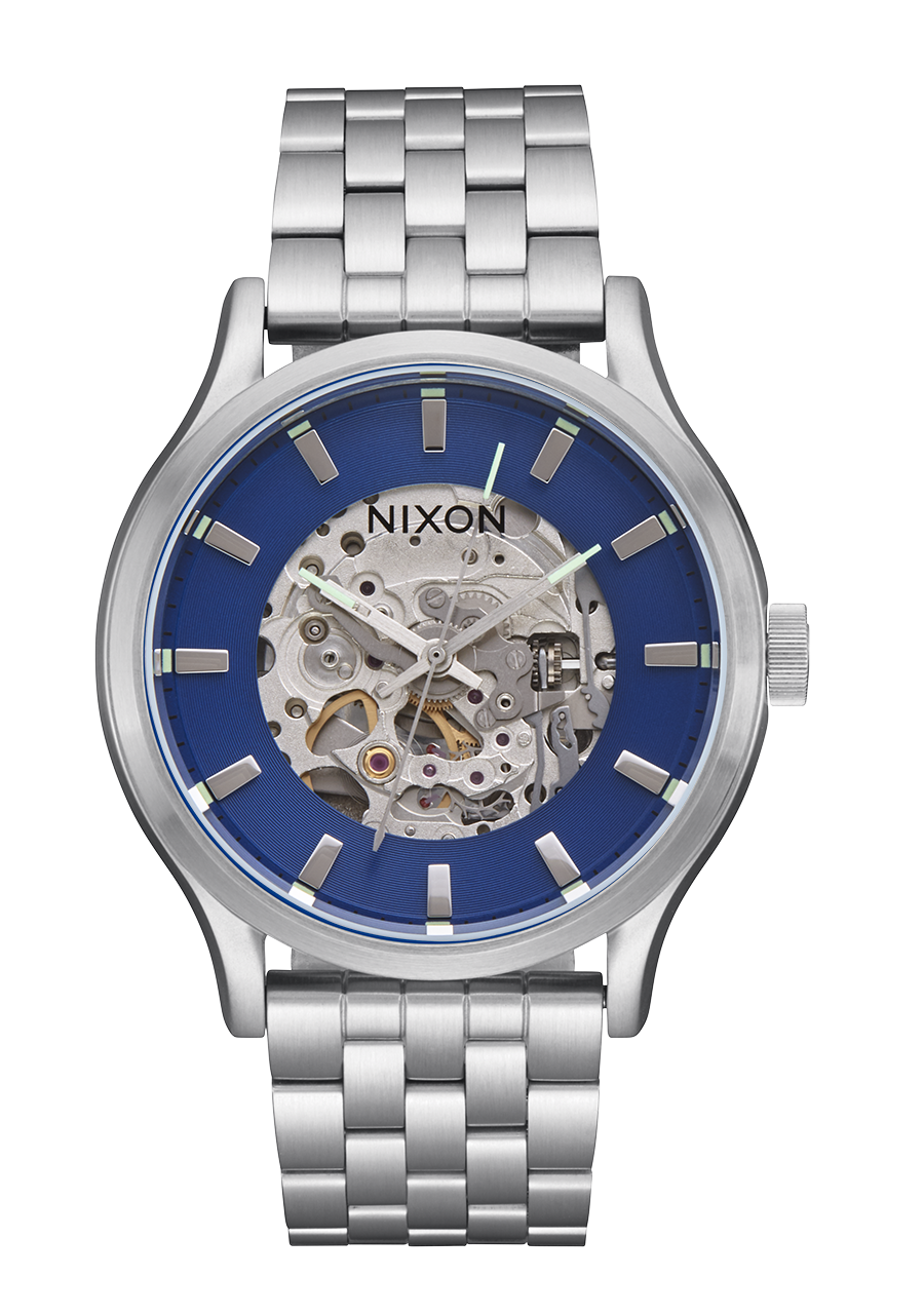 The Spectra sits exquisitely between defying tradition and paying homage to the classic art of watchmaking. Its twenty-one jewel automatic movement is fully displayed through the spectacular transparent skeleton face, punctuated by striking indices and the Nixon wordmark that appears to float above it all. It's daring, dimensional, and drops jaws anywhere it goes.