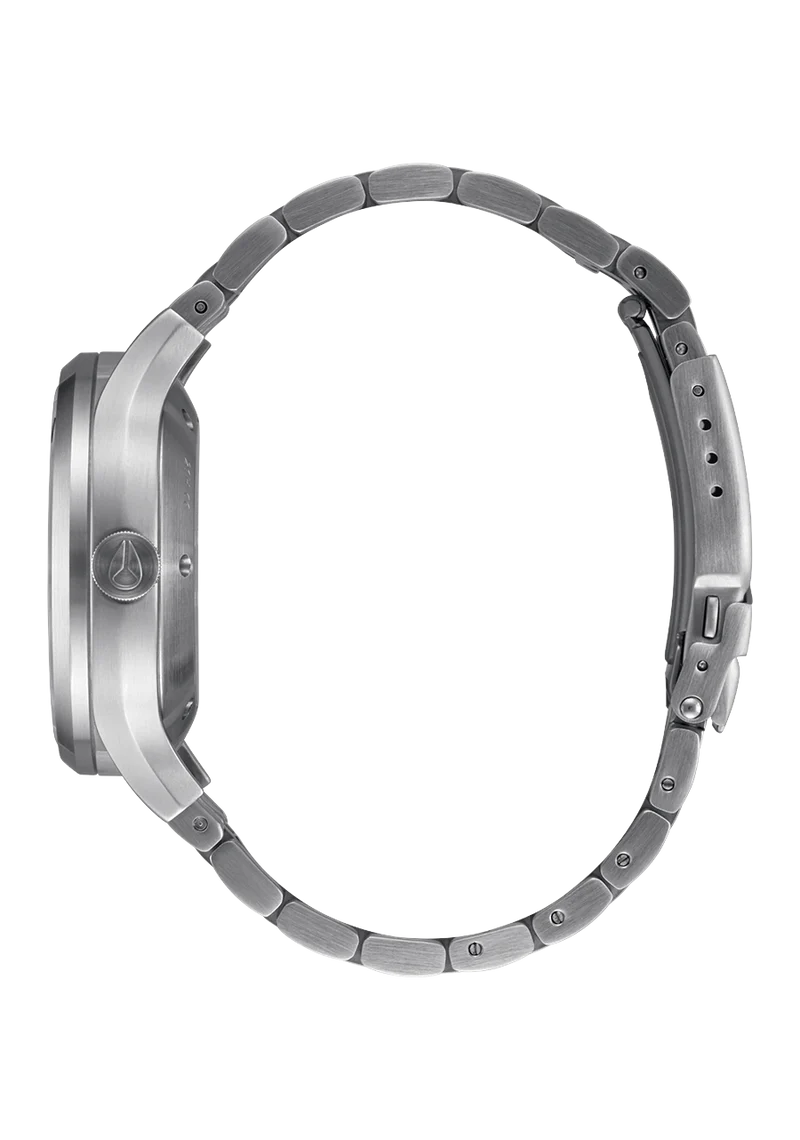 The Nixon Spectra case is made from solid stainless steel and is 40mm in diameter. The bracelet is a custom solid stainless steel 5-link bracelet, tapered from 20mm to 18mm, with a stainless steel double locking clasp and spring bar band connection. It features a free-swing band type and has a lug width of 20mm.