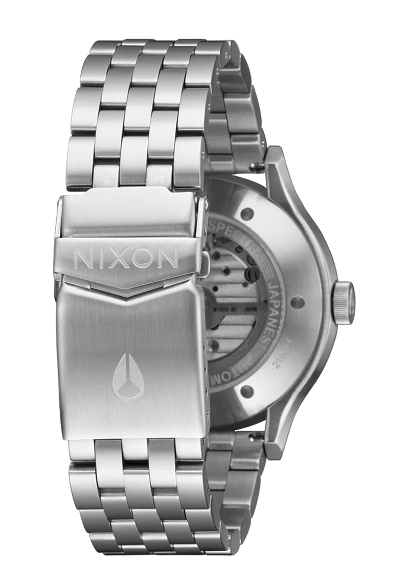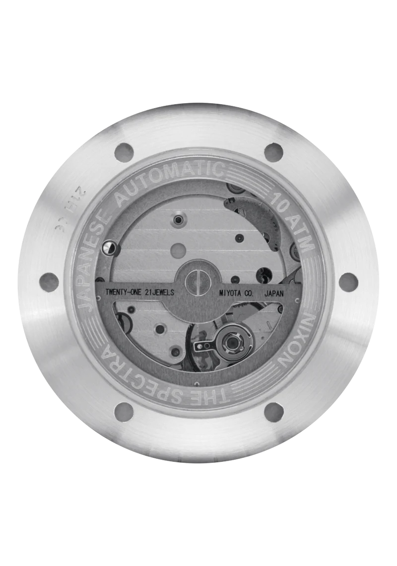 The Nixon Spectra uses a Premium Miyota 82S0 twenty-one jewel, three-hand, Japanese Automatic movement, which features a multidirectional tungsten flywheel winding system—the wearer’s wrist motion powers the mainspring through this rotor for automatic self-winding.