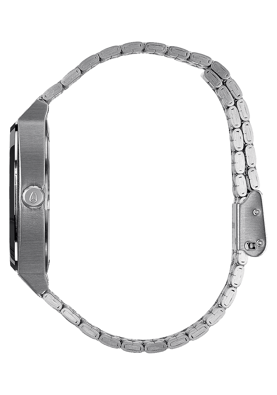 The Nixon Time Teller watch features a solid stainless steel case and a stainless steel bracelet, making it durable for daily wear and a hardened mineral crystal for added protection. The stainless steel case and bracelet provide protection against daily wear and tear, ensuring longevity and reliability.