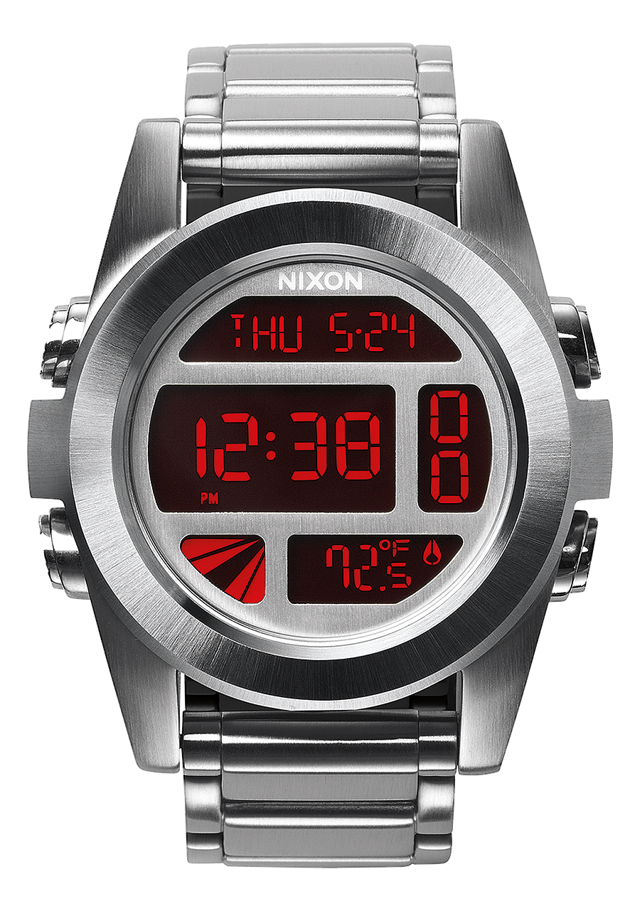 Custom digital movement with negative display, 12 or 24 hour time of day, calendar, temperature gauge, dual time, countdown timer, chronograph, alarm, and light functions.